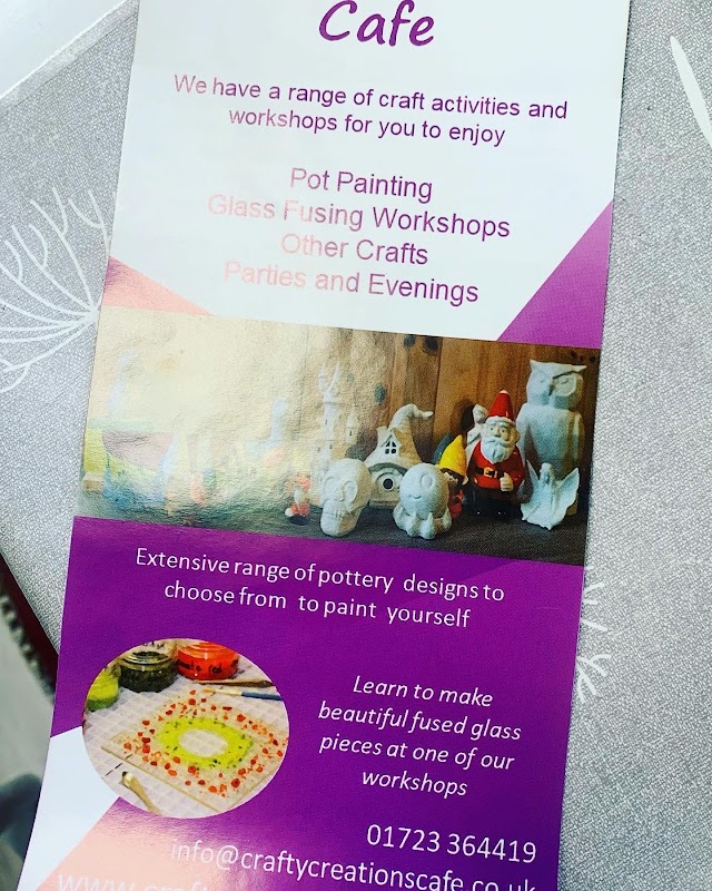 Crafty Creations Cafe is an indoor children's activity centre in Scarborough offering pottery painting, glass fusing, and jewellery-making for all ages. The venue features group booking options for occasions like baby showers and team building, accommodating various craft activities.