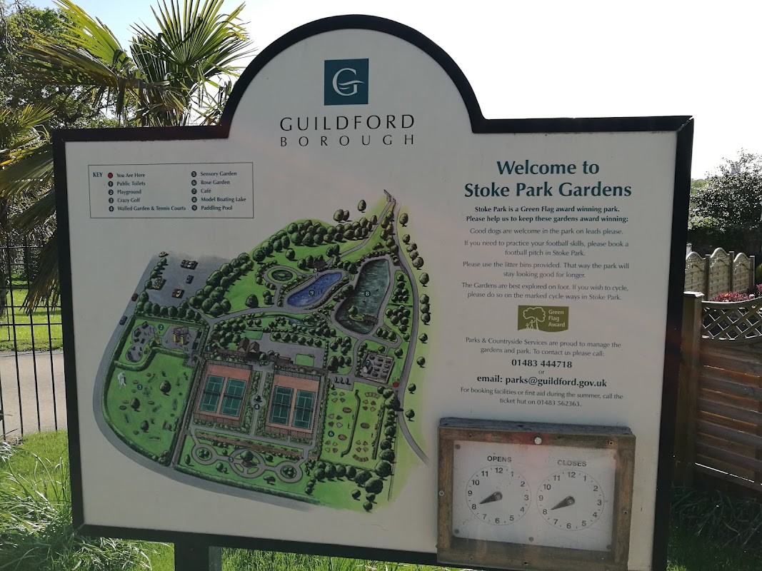 Stoke Park Gardens is an outdoor park in Guildford featuring 52 hectares of unspoiled grassland, a playground, and outdoor minigolf. It offers scenic walking spaces and is suitable for all ages.